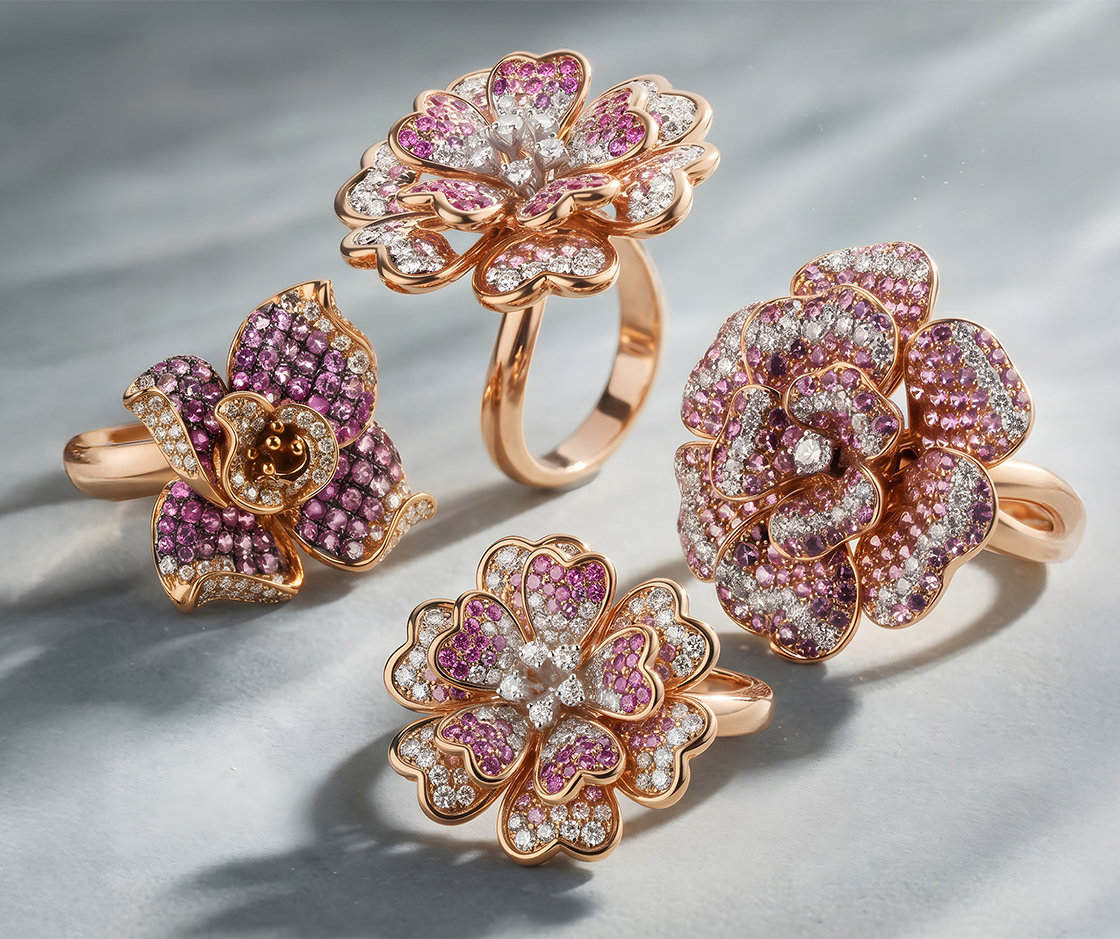 A flourishing garden made of gold and diamonds. This is the Flowers collection, which plays with types of flowers and petals. Colored and clear diamonds set in yellow, white and rose gold shaped into enchanting flowers. Traditional and exotic plants adorn ALO diamonds bracelets, earrings, rings and necklaces. The most represented is the rose, the collection offers a large selection of jewellery in the shape of roses.