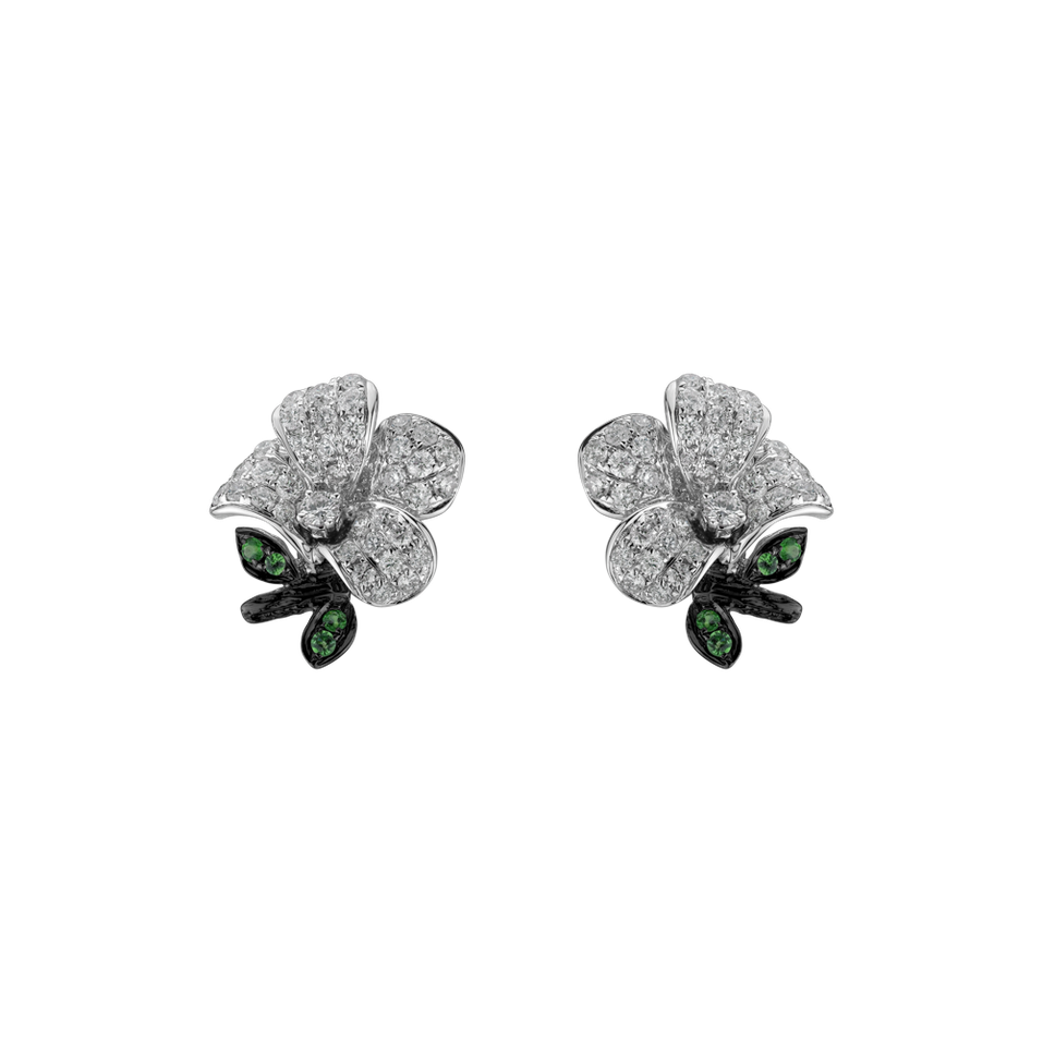 Be the star of the evening with these 18ct white and black gold diamond and green garnet earrings that are like a symphony of light. Their radiant shine will charm everyone who meets you, and their unique design will accompany you every step of the way, as your faithful companion in the journey of beauty and elegance. The jewelry is part of the Flowers collection.