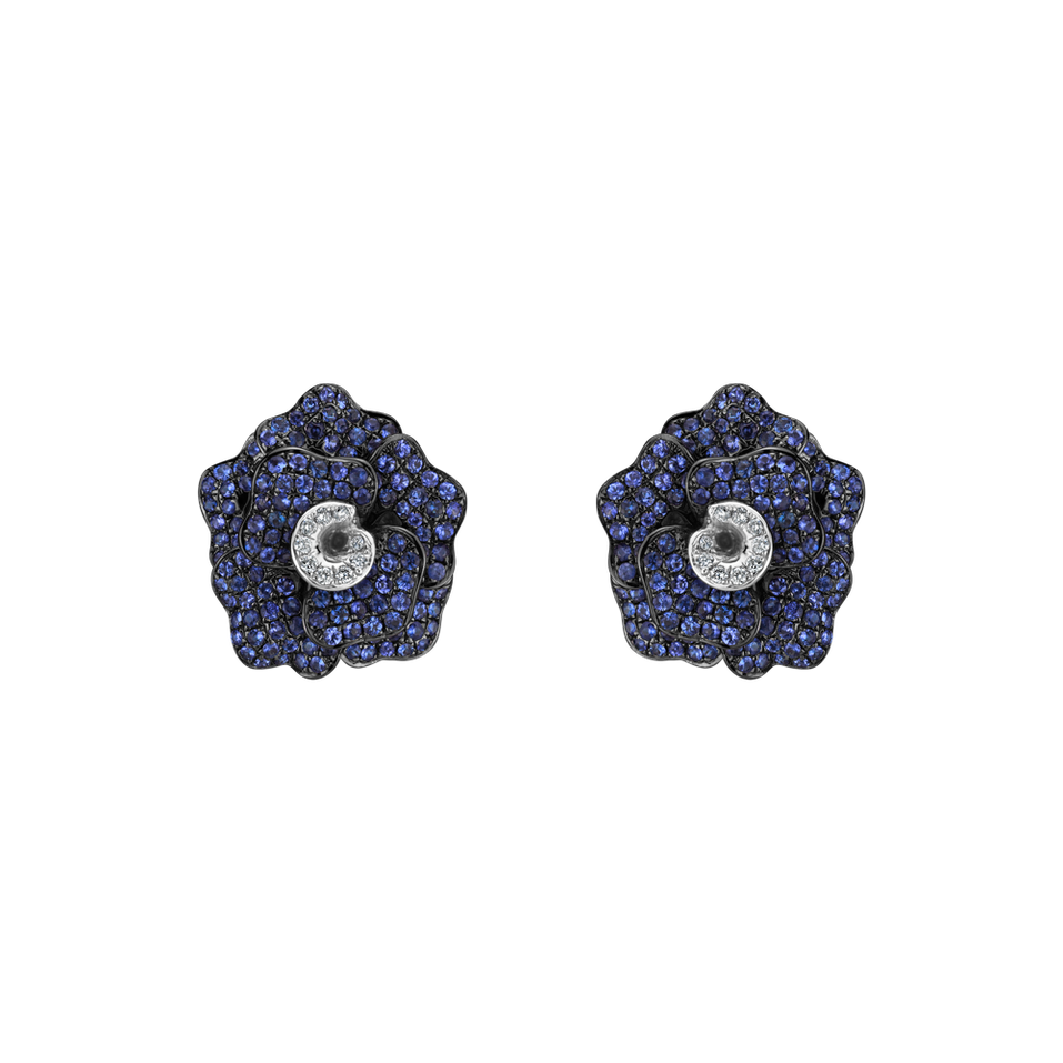 Exquisitely tuned earrings in 18ct black and white gold adorned with brilliant diamonds and deep sapphire are a solemn expression of the depth of your feelings and an opulent sign of your taste. The jewelry is part of the Flowers collection.