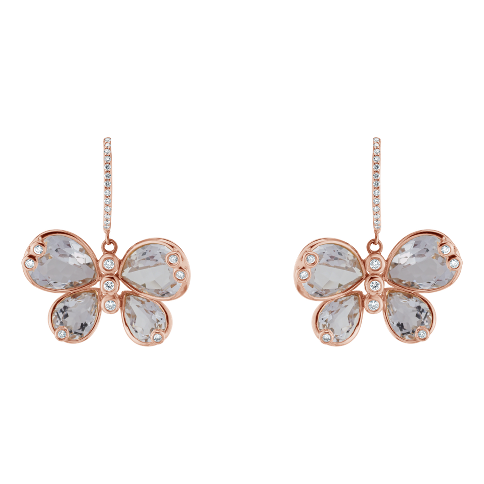 Exquisitely tuned earrings in 18ct rose gold decorated with brilliant diamonds and white topaz are a solemn expression of the depth of your feelings and an opulent sign of your taste. The jewelry is part of the Animals collection.
