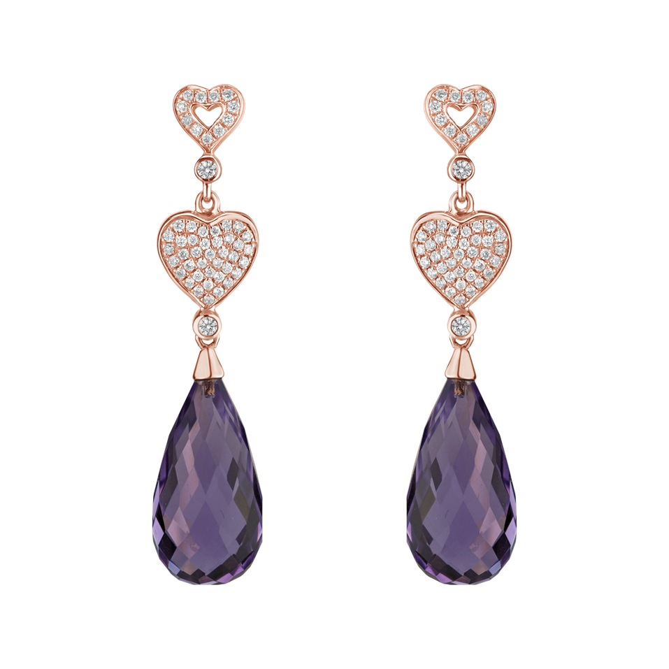 If you're looking for a statement of true sophistication, these 18ct rose gold diamond and Brazilian amethyst earrings are both the image and assurance of eternal sparkle and flawless luster. The jewelry is part of the Hearts collection.