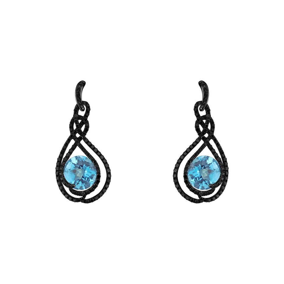 If you're looking for a statement of true sophistication, these 18ct white and black gold earrings with black diamonds and swiss topaz are both the image and assurance of eternal sparkle and flawless shine. The jewelry is part of the Fantasy collection.