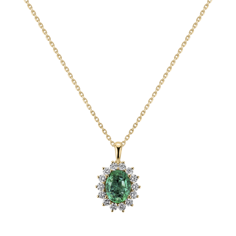 Courage is embodied in this 14ct yellow gold diamond and heart-warming emerald pendant designed for strong personalities who celebrate their success with the same seriousness with which they wear their jewelry. The jewelry is part of the Diana collection. Jewelry that a princess herself could wear. The entire collection is interwoven with bold center stones with sparkling diamond edging. The contrasting colors of the gemstones combined with the carefully selected shades of gold give rise to jewelry that you would find in a royal treasury. The ALO diamonds company has been producing jewelry from diamonds and precious stones in the Czech Republic for almost 30 years. Each piece of jewelry is therefore original and is also provided with a certificate of authenticity and delivered in a luxurious package. Whether you choose an engagement ring or a diamond bracelet or necklace, you are not only giving a piece of jewelry, but also a smart investment. The pendant is without a chain. The chain can be ordered at posta@alo.cz
