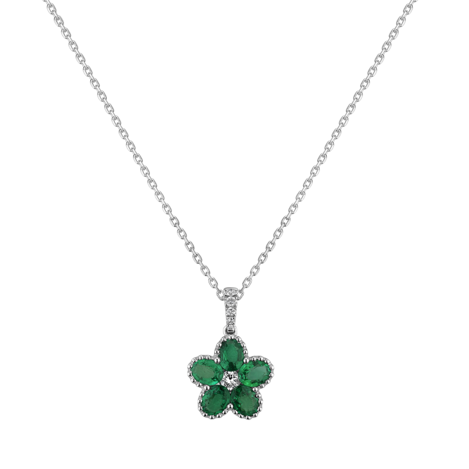 Keep close to your heart this 18ct white gold diamond and emerald pendant that promises to capture every ray of light and joy of every wonderful day. The jewelry is part of the Mirage collection. Delicate floral-inspired shapes - pave diamonds and gemstones of all colors. Romantic necklaces, rings, earrings and bracelets in yellow, white and rose gold transport you to a blooming meadow. The collection offers both girls' youthful jewelry and elegant sophisticated pieces. The ALO diamonds company has been producing jewelry from diamonds and precious stones in the Czech Republic for almost 30 years. Each piece of jewelry is therefore original and is also provided with a certificate of authenticity and delivered in a luxurious package. Whether you choose an engagement ring or a diamond bracelet or necklace, you are not only giving a piece of jewelry, but also a smart investment. The pendant is without a chain. The chain can be ordered at posta@alo.cz