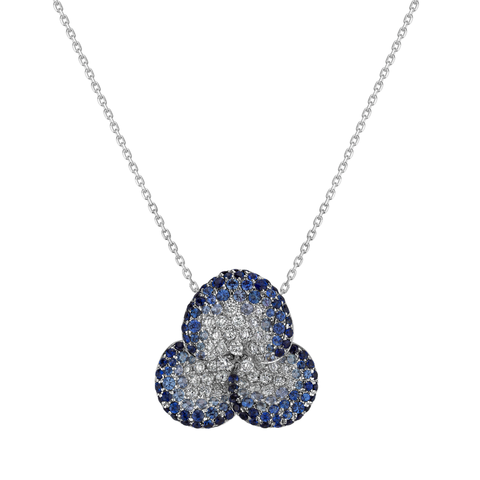 Elegant pendant in 18ct white gold decorated with diamonds and sapphires. The perfect accessory for any occasion to succeed. The jewelry is part of the Flowers collection. A blossoming garden that grew out of gold and diamonds. This is the Flowers collection, which plays with the elegance of flowers and leaves. Both colored and clear diamonds are set in yellow, white and rose gold shaped into charming traditional and exotic flowers. ALO diamonds bracelets, earrings, rings and necklaces in this collection are most often decorated with the queen of all flowers roses. The ALO diamonds company has been producing jewelry from diamonds and precious stones in the Czech Republic for almost 30 years. Each piece of jewelry is therefore original and is also provided with a certificate of authenticity and delivered in a luxurious package. Whether you choose an engagement ring or a diamond bracelet or necklace, you are not only giving a piece of jewelry, but also a smart investment. The pendant is without a chain. The chain can be ordered at posta@alo.cz