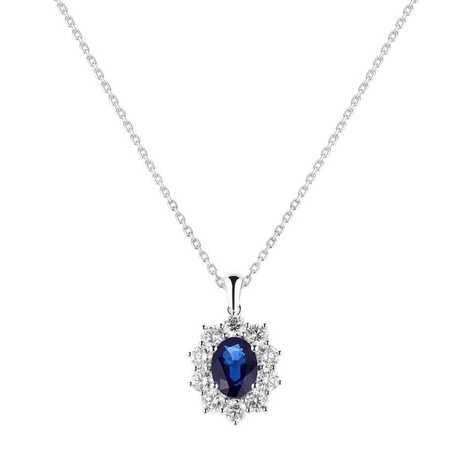 Courage is embodied in this 14ct white gold diamond and heart-warming sapphire pendant designed for strong personalities who celebrate their success as seriously as they wear their jewelry. The jewelry is part of the Diana collection. Jewelry that a princess herself could wear. The entire collection is interwoven with bold center stones with sparkling diamond edging. The contrasting colors of the gemstones combined with the carefully selected shades of gold give rise to jewelry that you would find in a royal treasury. The ALO diamonds company has been producing jewelry from diamonds and precious stones in the Czech Republic for almost 30 years. Each piece of jewelry is therefore original and is also provided with a certificate of authenticity and delivered in a luxurious package. Whether you choose an engagement ring or a diamond bracelet or necklace, you are not only giving a piece of jewelry, but also a smart investment. The pendant is without a chain. The chain can be ordered at posta@alo.cz