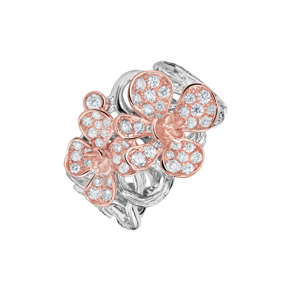 Vrcholně elegantní prsten inspirovaný rozkvetlou loukou ve svůdné kombinaci bílého a růžového zlata s konturami rafinovaně zdobenými třpytivými diamanty nejvyšší kvality.