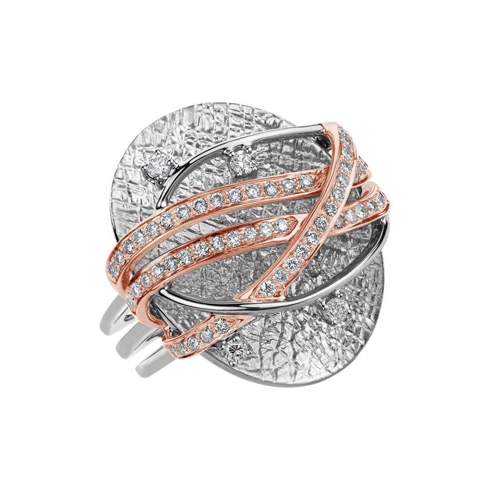 This 18ct white and rose gold ring with diamonds is the perfect example that true beauty can be simple yet striking. All you need is inspiration and careful work. The jewelry is part of the Charming collection.
