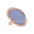 An exclusive ring in 14ct rose gold, decorated with diamonds and blue chalcedony, is a masterpiece of jewelry art. Its unique design and extraordinary beauty of blue chalcedony reveal true elegance. The jewelry is part of the Blossoms collection.