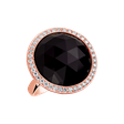 The 18ct rose gold ring with diamonds and onyx is a subtle yet confident statement of sophistication and fresh elegance. The diamond accent adds a touch of luxury to this ring, while the onyx brings an earthy beauty to your look. This ring is the perfect accessory for any occasion, highlighting your unique elegance. The jewelry is part of the Fantasy collection.