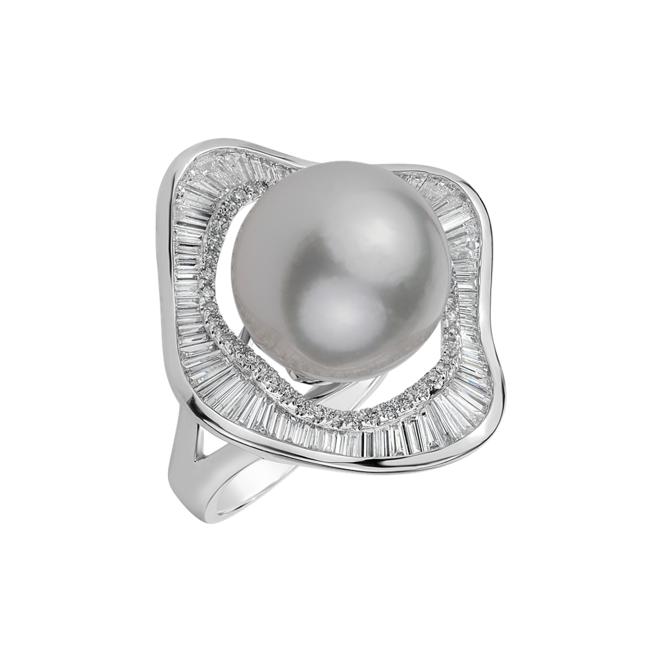 Pearls in your jewelry box - purity, timelessness and beauty. A beautiful 18ct white gold ring with diamonds and sea white pearl will impress with its unique design and add a touch of romance to your look. The jewelry is part of the Ocean & River collection.