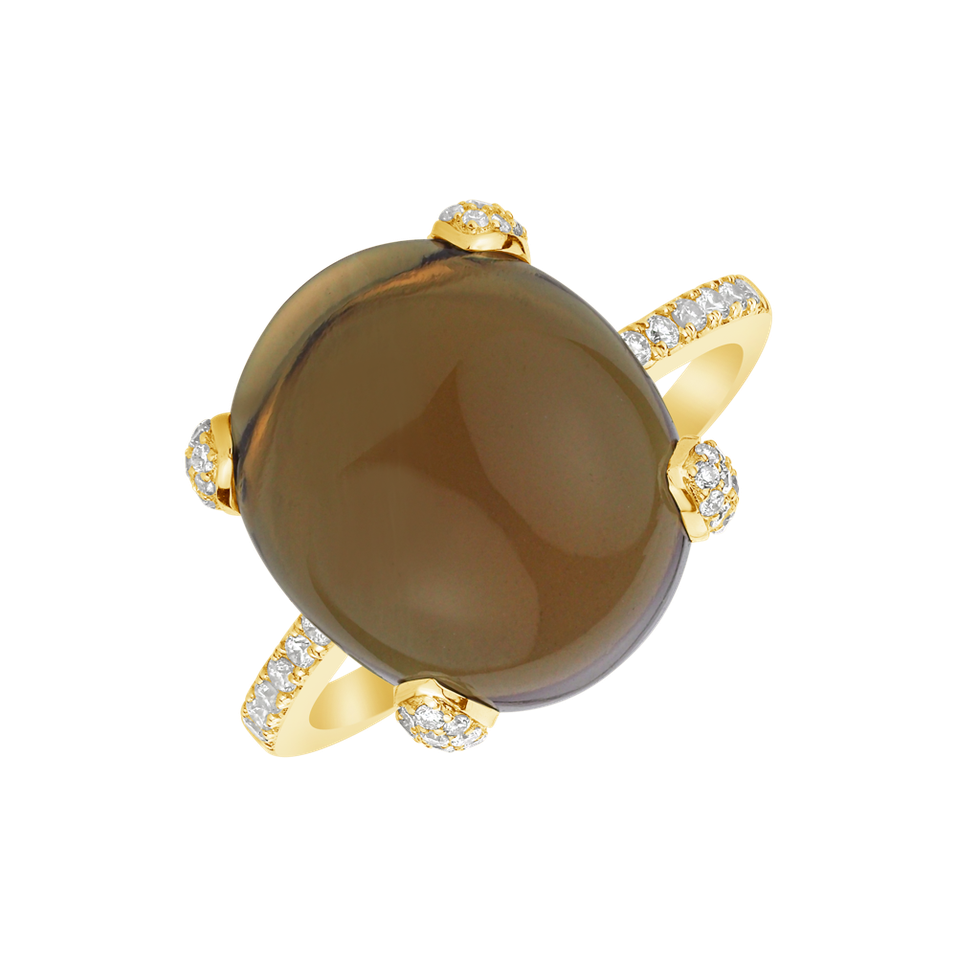 A collection inspired by blossoming orchards and gardens. The main role in it is played by colored gemstones with semi-circular cabochon cut. Blue topaz, purple amethyst, green chalcedony and other gemstones are set in white, yellow and rose gold rings, earrings and pendants. The round shapes of the jewelry and the stones themselves are the embodiment of timelessness and delicate feminine energy.