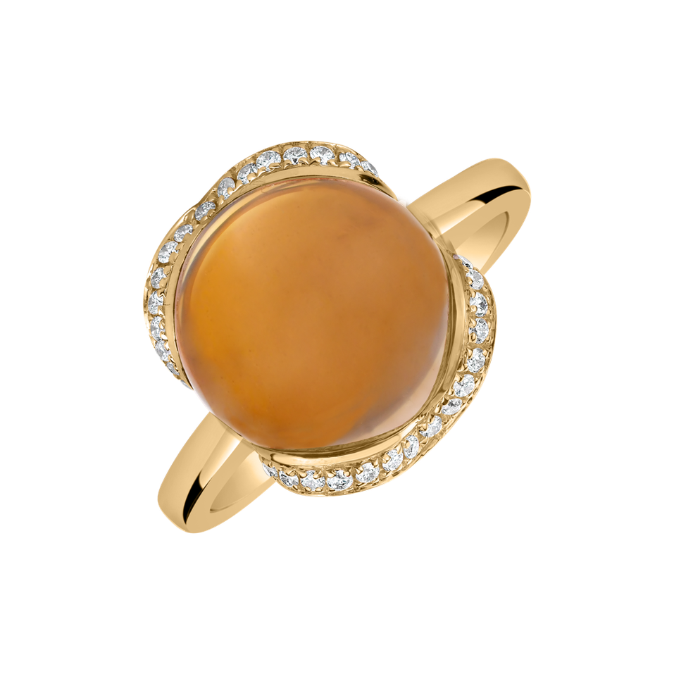 This 14ct yellow gold ring with diamonds and cognac quartz is an expression of your unique style and taste. Cogniak quartz brings warm luxury and beauty to your life, while diamonds give the ring an unmistakable shine. The jewelry is part of the Blossoms collection.