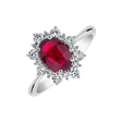 Crafted from the purest 14ct white gold and set with diamonds that shine intensely like the stars in the night sky, this ring is crowned at the heart by a fiery ruby, symbolizing passionate and indestructible love. The jewelry is part of the Diana collection.