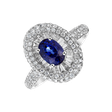 Exklusivní prsten s dominantním okouzlujícím safírem zasazeným do diamantového lůna pohádkového třpytu, připomínající svou honosností klenot z královských šperkovnic.