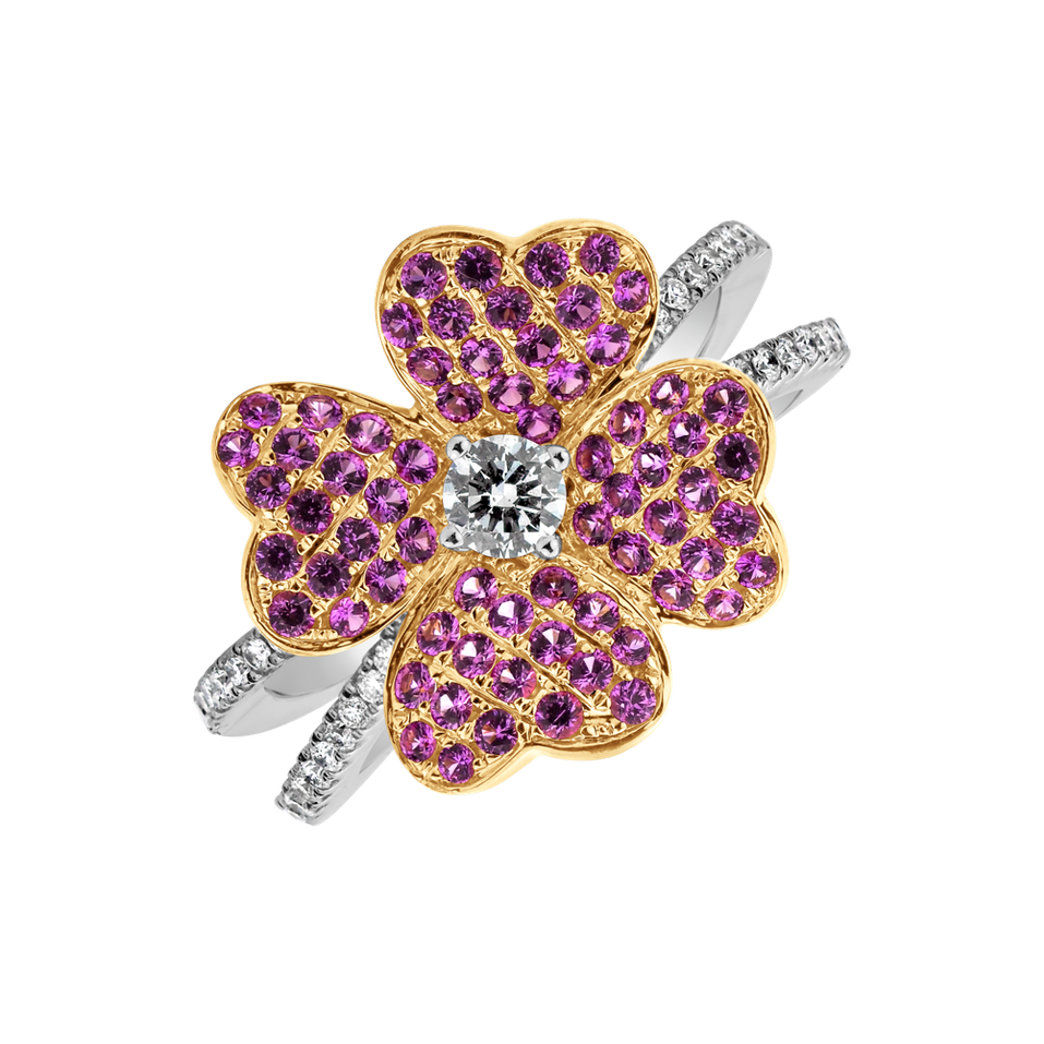 If you're looking for a statement of true sophistication, this 18ct white and yellow gold diamond and pink sapphire ring is both the image and assurance of eternal sparkle and flawless luster. The jewelry is part of the Flowers collection.