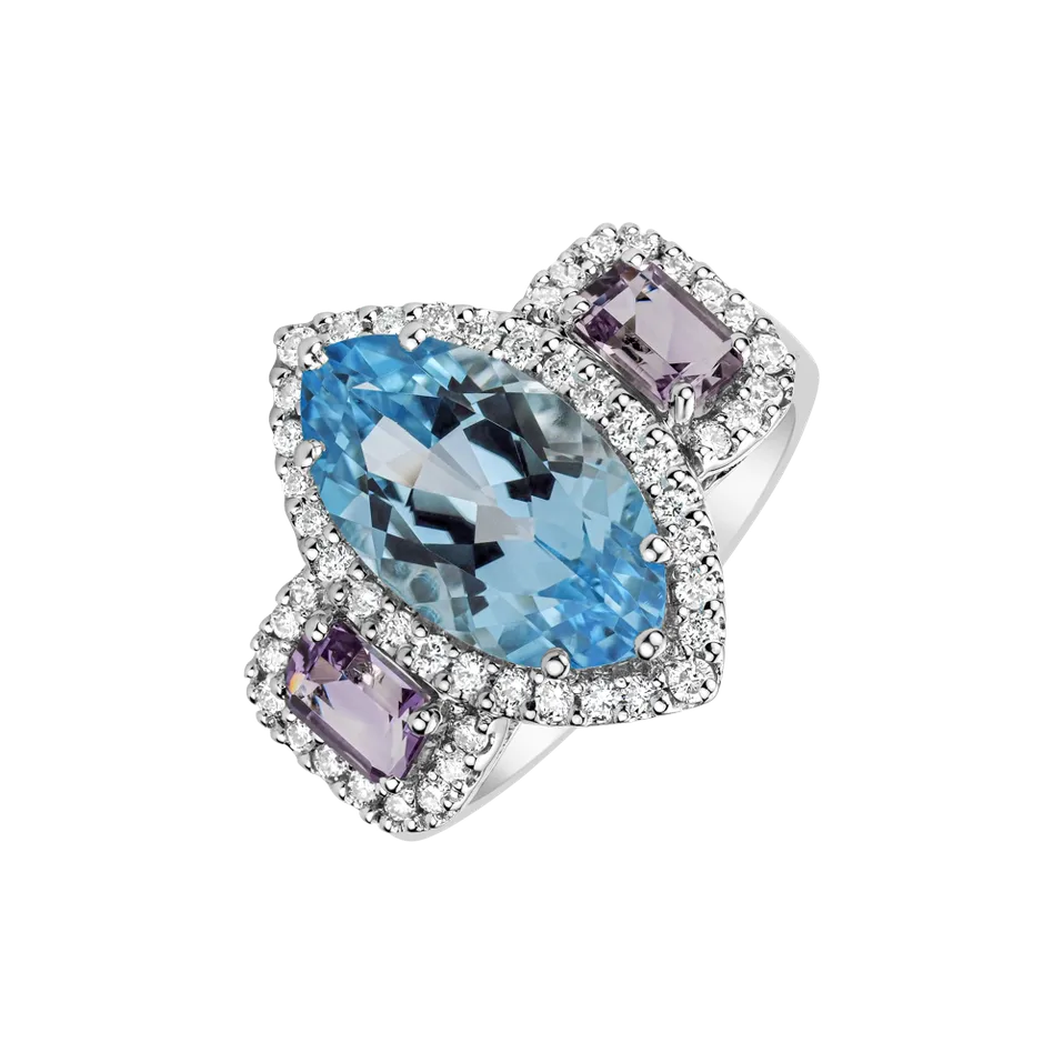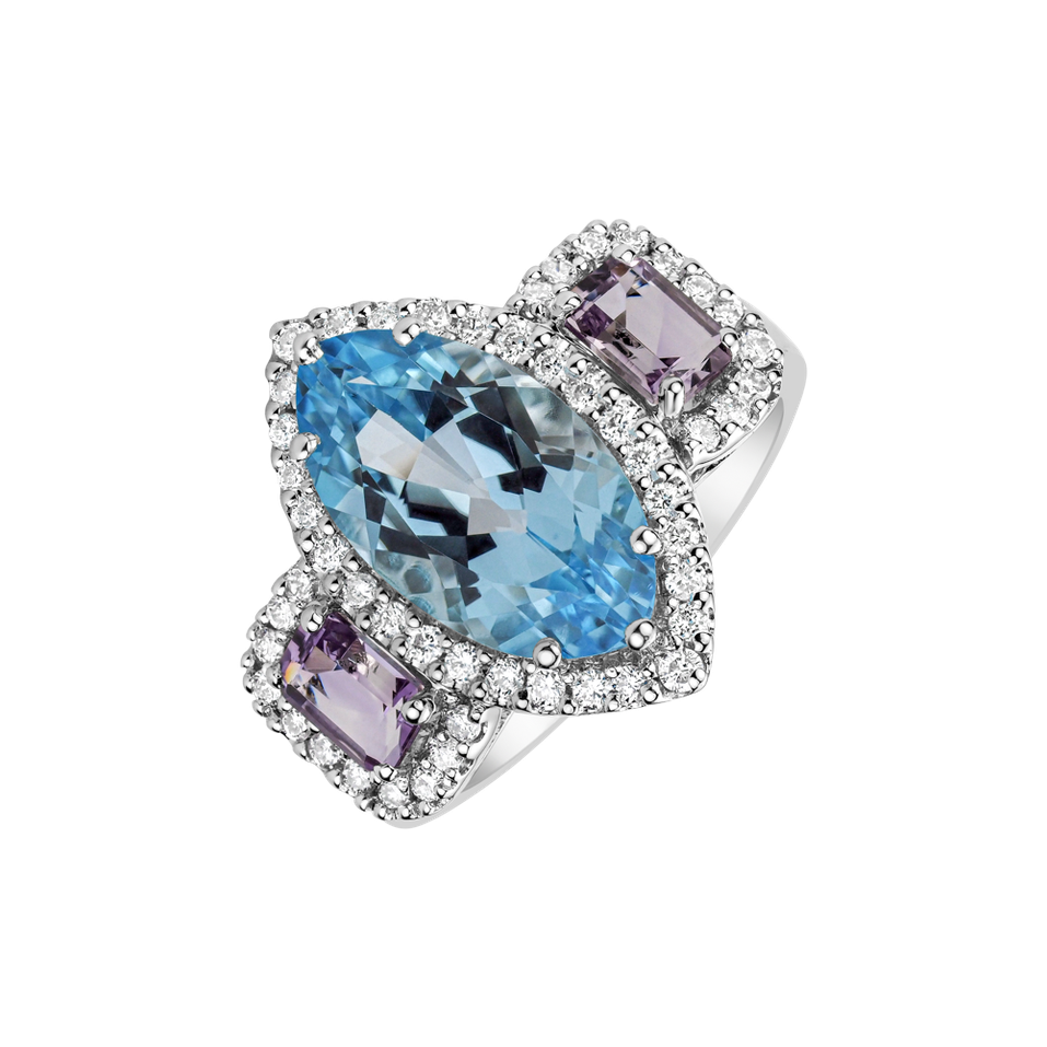 Celebrate unique design and honest craftsmanship in this 18ct diamond, swiss topaz and pink amethyst ring, the perfect expression of spectacular beauty. The jewelry is part of the Fantasy collection.