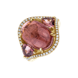 This 18ct yellow gold diamond and pink tourmaline ring is like a work of art. Each stone, carefully selected and set, tells a story of joy, inspiration and unrepeatable beauty. The jewelry is part of the Blossoms collection.