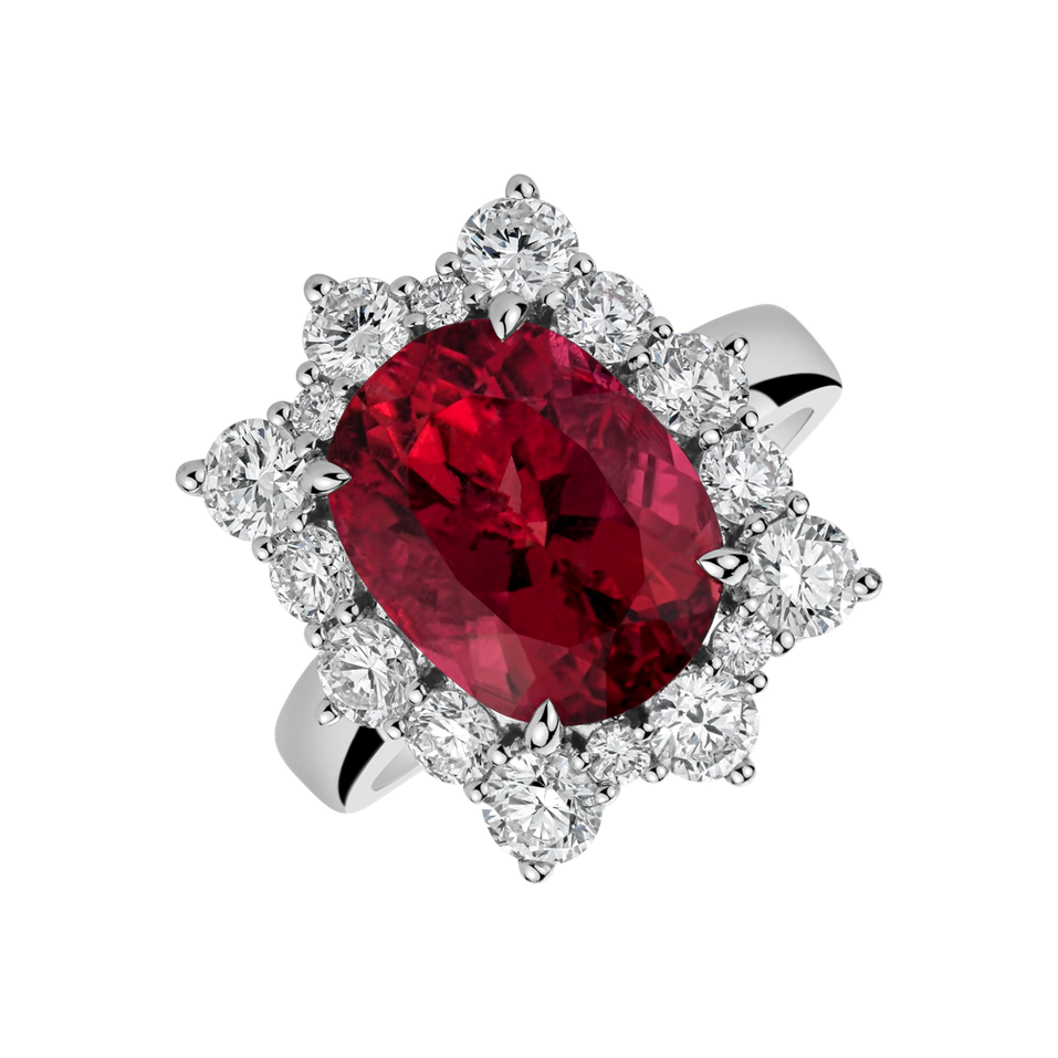 This 18ct white gold ring is decorated with beautiful diamonds and pink tourmaline. It is the perfect accessory for every personality with taste. Its unique design and beautiful pink tourmaline give the piece a radiant elegance. It will be a great addition to your outfit and will bring you lots of compliments. The jewelry is part of the Royal collection.