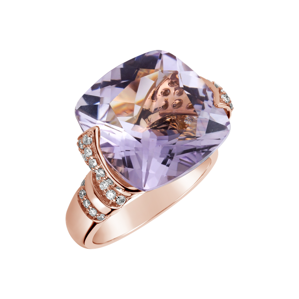 This 18ct rose gold diamond and pink amethyst ring is like a flower blooming under the spring sun. Its subtle elegance and sparkling diamond crown are a fabulous combination of luxury and romance. The jewelry is part of the Fantasy collection.