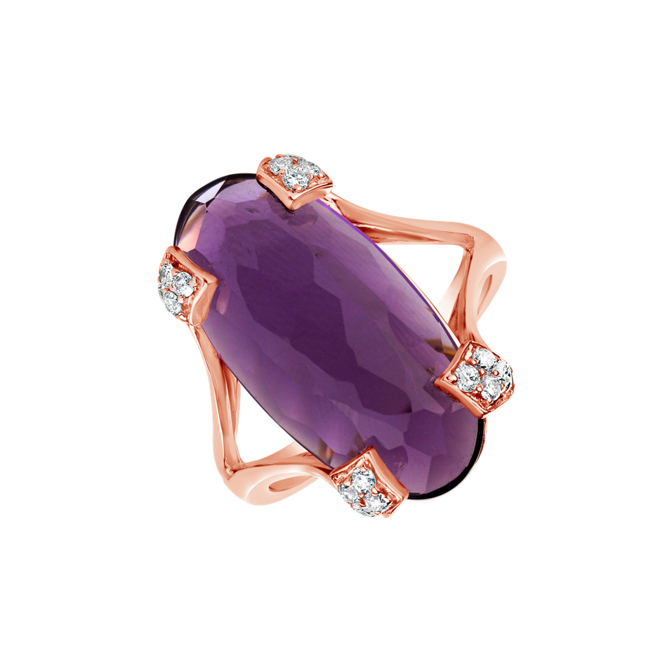This 18ct rose gold ring is a masterpiece where diamonds combine with Brazilian amethyst to create the perfect guide on the journey of style and beauty. Made with the highest precision and skill. The jewelry is part of the Fantasy collection.