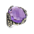 A ring in 18ct black gold with diamonds and Brazilian amethyst, boasting its perfection and carefully selected stones, it is a symbolic seal of eternal elegance. The jewelry is part of the Fantasy collection.
