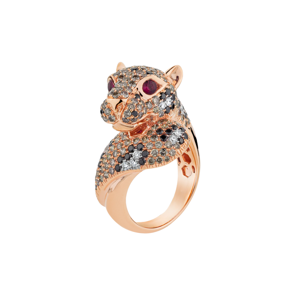 Ring with white, brown and black diamonds and Ruby Shining Cheetah